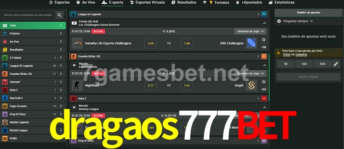O dragaos777bet oferece uma grande seleção de opções de apostas em e-sports com probabilidades competitivas